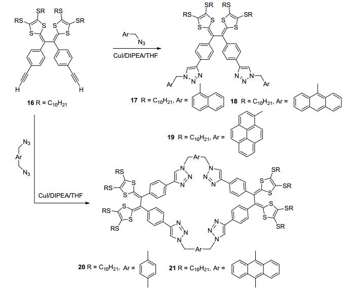 开发基于TTF的荧光传感器是超分子化学中的一个热门课题[30, 31]. 2012年, Zhao等[32]利用CuI催化剂将含端基炔的乙烯基TTFV衍生物14和9-叠氮甲基蒽反应, 点击合成新型TTFV衍生物15 (Eq. 2), 其中央TTFV核心作为电子供体, 两个蒽基团作为荧光单元, 两个三氮唑环既为电子供体和荧光单元的连接基, 又为键合金属离子的受体单元.荧光和紫外光谱实验表明, TTFV 15可作为Cu2+、Fe2+和Cd2+光谱探针, 是首例基于TTFV的光谱离子传感器, 其检测限达到微摩尔浓度级水平, 有望在环境修复、生物学研究和工业分析等领域广泛应用. 2013年, 该课题组利用同样的方法合成了基于TTFV的含稠环芳烃和大环的TTF系列衍生物17~21 (Scheme 4), 并通过紫外和荧光光谱详细研究了它们分别与富勒烯C60和C70的超分子相互作用行为, 结果表明分子钳式的TTFV衍生物17和大环结构20与富勒烯作用很弱, 而化合物18, 19和21与富勒烯作用较强, 并可以用来分离富勒烯C60和C70[33].
