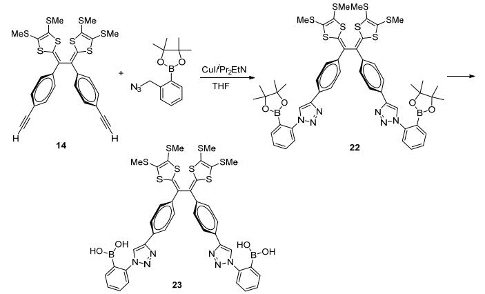 2014年, Zhao等[38]将含端基炔的乙烯基TTFV衍生物14和邻叠氮甲基苯硼酸酯利用CuI催化剂, 点击合成TTFV衍生物22, 其经水解得到新型基于TTFV的硼酸化合物23 (Scheme 5).电化学(CV和DPV)实验表明, 在磷酸盐缓冲(pH=7.41) 的DMSO-H2O溶液中, 化合物23可以和不同单糖显示选择性电化学反应, 可作为潜在应用的糖类传感器.同时化合物22可以选择性电化学识别F-离子.