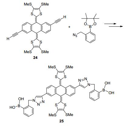 2010年, Zhao等[39]将含双端基炔的蒽醌基exTTF衍生物24和邻叠氮甲基苯硼酸酯利用CuI催化剂, 点击合成exTTFV衍生物25 (Scheme 6).电化学(DPV)实验表明, 在磷酸盐缓冲(pH=8.75) 的DMSO-H2O溶液中, 化合物25可以与果糖和核糖选择性电化学识别反应, 这是首例基于exTTF的糖类分子传感器.由于化合物25在水溶液中的溶解度和溶液粘度等限制了其定量应用范围, 因此, 修饰开发新型的基于TTF的糖类分子传感器是一个重要方向.