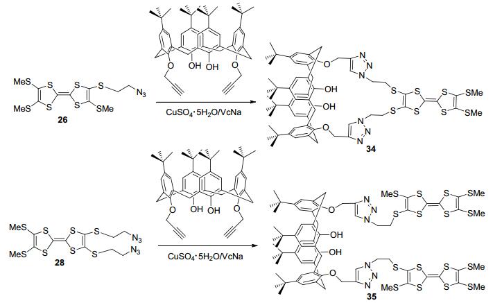 杯芳烃作为第三代超分子主体化合物得到了广泛的研究和应用, 其中CuAAC点击反应在杯芳烃衍生的合成及其分子识别方面获得了广泛的关注[44]. 2013年, Zhao等[45]首次利用CuSO4·5H2O-抗坏血酸钠(VcNa)催化剂, 将含叠氮端基TTF衍生物26和28分别与下缘含端基炔的杯芳烃发生点击反应得到三氮唑基连接的杯芳烃-四硫富瓦烯二联体34和35 (Scheme 7).循环伏安法实验表明, 34和35均显示可逆两电子氧化还原行为.同时, 紫外光谱实验研究了金属离子如Pb2+、Sc3+、Zn2+诱导的34和35分别与四氯对苯醌分子间的电子转移行为, 结果表明不同的金属离子对电子转移的影响不同.对于同一金属离子, 化合物35的电子转移能力大于34, 表明配位作用、构象和分子柔韧性等对分子间电子转移行为有重要影响, 这对于开发基于TTF超分子的分子间电子转移体系具有重要意义.