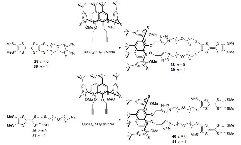 2015年, Zhao等[46]利用CuSO4·5H2O-抗坏血酸钠(VcNa)催化剂, 通过CuAAC点击反应将含叠氮端基的TTF衍生物(26、28、36、37)和含端基炔的硫桥杯芳烃(TCA)合成得到TTF-TCA二联体化合物38~41 (Scheme 8).通过紫外光谱实验探讨在非氧化性金属离子存在下, TTF-TCA二联体38、39、40和41分别与四氯对苯醌的分子间电子转移行为, 结果表明Sc3+促进电子转移行为最为有效.在同一金属离子存在下, 化合物41和40比化合物39和38表现出更高效的电子转移行为.