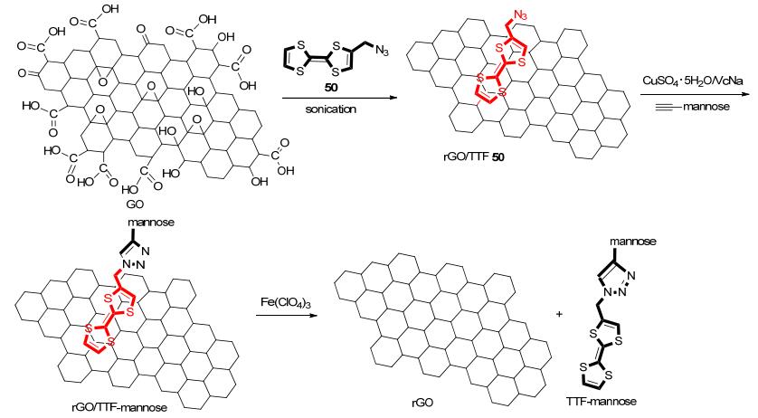 石墨烯具有二维碳六角晶格结构, 其显著的大比表面积和电、热、机械性能引起了在新型复合材料、生物传感和催化剂领域的研究兴趣. 2012年, Szunerits等[59]首先将含叠氮端基TTF衍生物50和氧化石墨烯(GO)超声溶解, 利用TTF的供电子性质将氧化石墨烯(GO)还原来构筑基于石墨烯的纳米杂化材料.然后利用CuAAC点击反应将其作为基质与含端基炔的甘露糖反应得到含糖的石墨烯材料(Scheme 9).通过Fe(ClO4)3氧化作用可以控制糖从该石墨烯基质材料中解离, 这对于开发新型基于石墨烯的纳米生物界面材料具有重要意义.