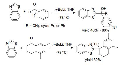 2010年, Olsson等[19]合成了含苯并噻唑结构的药物, 在基于功能细胞的测定中被鉴定为钙传感受体(CaST)的正变构调节剂(PAM).该反应通过苯并噻唑和芳香酮的直接偶联得到目标产物(Scheme 2).反应采用常规的丁基锂/-78 ℃反应体系, 合成出具有药物活性的苯并噻唑衍生物, 该类物质的合成进一步说明了苯并噻唑基团在药物分子创制中的重要作用.