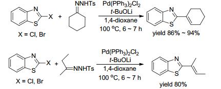随后2012年, Prabhu等[21]也采用Pd催化的烷基化反应合成取代烯, 反应以2.5 mol% Pd(PPh3)2Cl2作催化剂, t-BuOLi作碱, 100 ℃反应条件下实现了2-卤代苯并噻唑和腙的烷基化反应(Scheme 3).相比同类反应, 该体系不需加入其他任何添加剂, 催化剂用量少, 分离产率高.同年, Miura课题组[22]也以N-对甲苯磺酰腙为烷基化试剂, 采用相似的催化条件, 额外加入苯酚作配体, 采用Ni/Co-催化实现苯并噁唑(苯并噻唑)的2-位烷基化反应(Eq. 8).