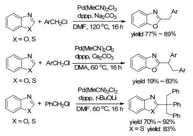 随后, 2012年黄汉民和夏春谷等[29]报道了类似于Miura课题组的Pd-催化体系Pd2(dba)3/dppp/NaOAc, 以5 mol% Pd(MeCN)2Cl2作催化剂, 6 mol% dppp作配体, 碱的作用下选择性催化杂芳苄基化偶联(Scheme 4).作者发现, 通过控制使用不同的碱, 苯并噁唑和苄氯可以得到一苄基、二苄基、三苄基偶联产物, 苯并噻唑未发现此现象, 仅提供了三苄基偶联产物.该烷基化体系中, Pd-催化剂在反应中起到至关重要的作用, 碱促进芳杂环形成2-位的金属键, 也促进了多苄基的形成.