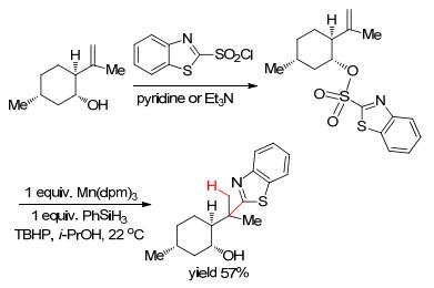 同年, Shenvi等[34]报道了一种Mn催化氢电子转移(HAT)的自由基芳基化8-芳基薄荷醇的合成.该反应采用两步进行, 首先通过HAT芳基磺酰氯和异蒲勒醇磺酰化, 再进行芳基迁移、脱磺酰基合成目标产物(Scheme 5).由于醇官能团的选择性电离导致直接采用H2SO4/PhH介导的Friedel-Crafts芳基化产物复杂, 故作者研究了自由基催化的HAT烷基化偶联反应.该反应设计巧妙, 免了Friedel-Crafts芳基化的复杂产物、具有良好的产率, 自由基氢电子转移机理对后续的研究具有十分重要的参考意义.