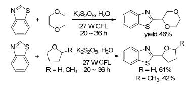 2013年, 强琚莉和陈兆旭等[35]报道了Cu催化交叉脱氢偶联反应(Eq. 23).该反应以Cu(OTf)2作催化剂, K2S2O8作氧化剂, 60 ℃条件下反应14 h实现了苯并噻唑和醚的直接偶联.该反应具有广泛的适用性, 对各种噻唑衍生物、苯并噻唑衍生物和四氢呋喃、1, 4-二氧六烷均能进行偶联, 且反应条件温和、分离产率良好.