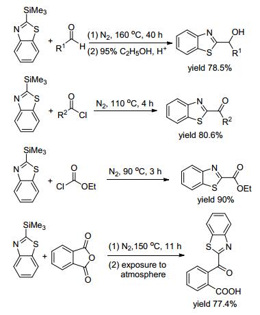 1971年, Thames等[37]对Beel课题组的方法进行改进, 将低温反应体系逐渐升温至室温, 使产率达到75%~80%.作者发现该C—Si断裂能和氯甲酸乙酯、醛、邻苯二甲酸酐进行偶联, 形成2-位的羰基类取代产物, 且都得到很好的产率(Scheme 7).该反应体系也存在着反应敏感、反应温度高等缺点. 2007年Koskinen等[38]报道了一种CuI/ZnCl2催化合成二芳酮的方法(Eq. 20).此路线是采用很常见的合成方法, n-BuLi作碱夺取苯并噻唑2-位的氢, 再和苯甲酰氯偶联.反应中二芳酮主要是以中间体的形式存在, 该杂二芳酮最终是被合成新型的脂肪酸酰胺水解酶抑制剂, 从而说明苯并噻唑在新药物合成中具有重要的价值.