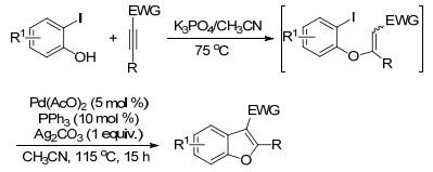 Larock等[30]以邻碘代酚、端基芳炔和芳基碘为原料, 通过微波促进下和Pd催化的三种组分“一锅”反应, 用较短的反应时间高收率地转化为2, 3-取代的苯并呋喃化合物(Eq. 18).反应效率几乎不受酚环上取代基电子效应的影响, 但是酚羟基邻位有较大体积取代基如烯丙基等存在时, 位阻会导致收率下降.此外, 部分溶解性较差的底物会影响第一步Sonogashira偶联反应的发生, 从而导致两步反应的总收率下降.底物扩展研究表明:当芳炔底物中有强吸电子基团如腈基存在时, 环合反应不能发生.脂肪族端基炔在同样的条件下也无法得到相应的呋喃产物.
