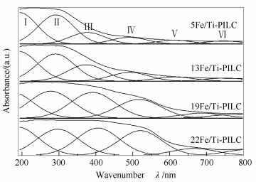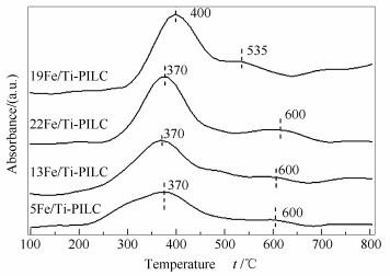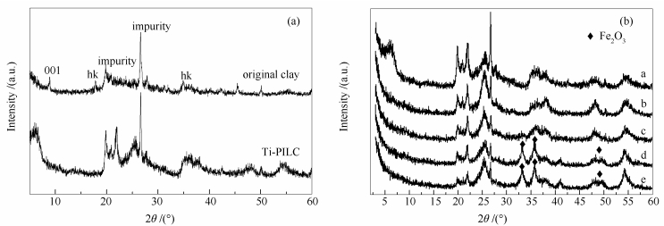 a: Ti-PILC; b: 5Fe/Ti-PILC; c: 13Fe/Ti-PILC; d: 19Fe/Ti-PILC; e: 22Fe/Ti-PILC