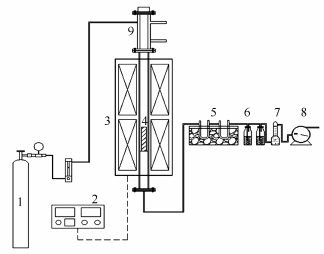 1: N2 cylinder; 2: temperature controlling system; 3: fixed bed reactor; 4: sample basket; 5: condensing unit; 6: washing unit; 7: filter unit; 8: cumulative flow meter; 9: water-cooling jacket