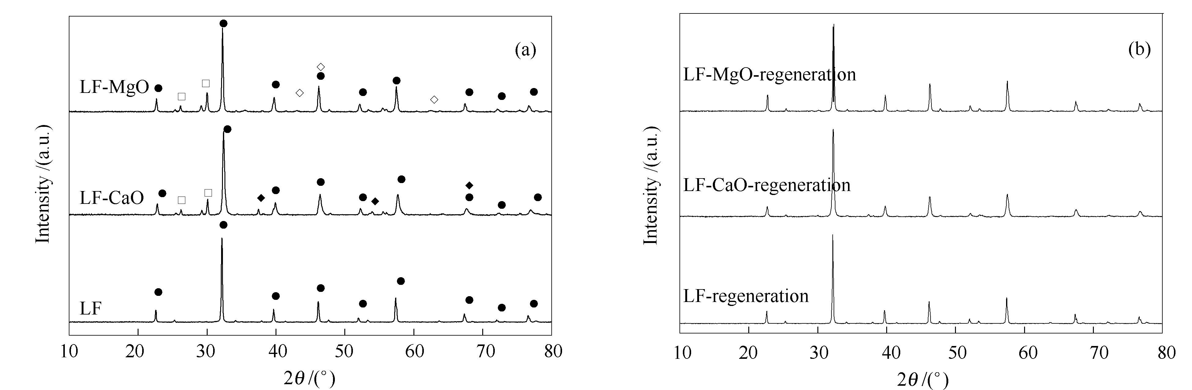 ●: orthorhombic phase; □: La2O3; ◆: CaO; ◇: MgO