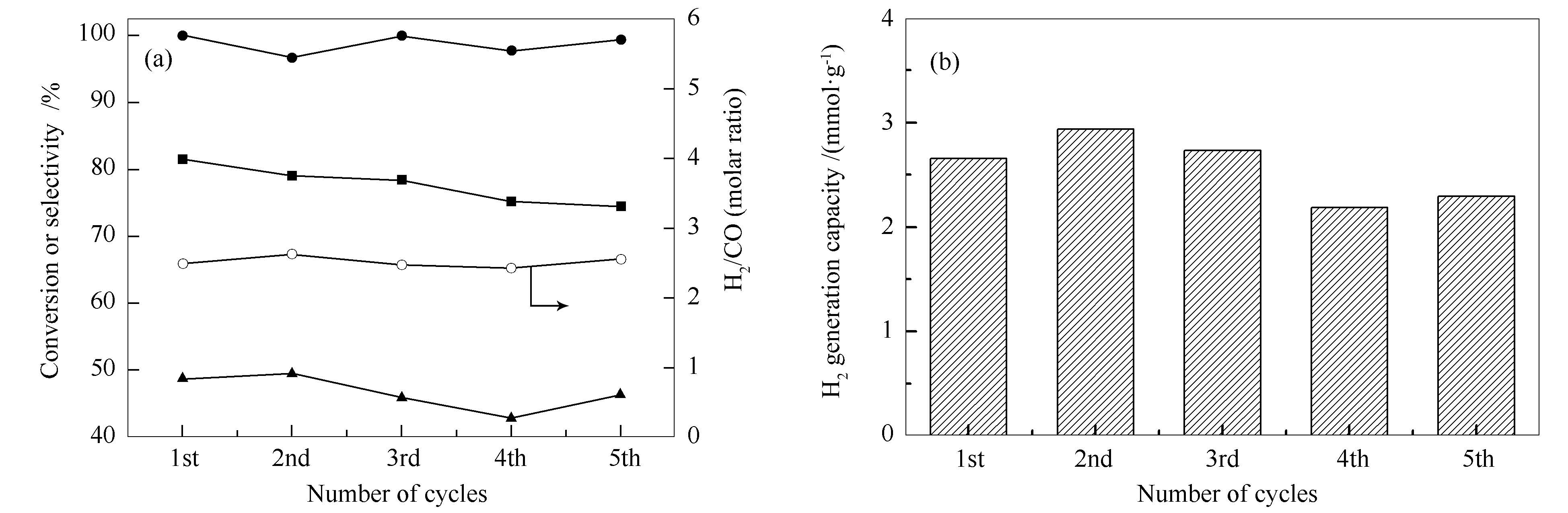 (a)methane reduction step (b) steam oxidation step ■: CH4 conversion; ●: CO selectivity; ▲: H2 selectivity