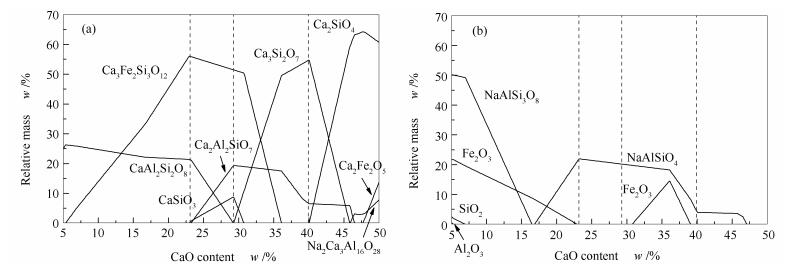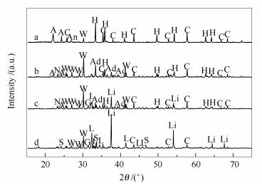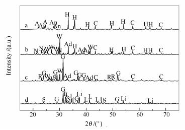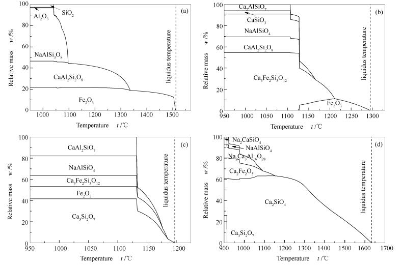 a: CaO 5%; b: CaO 25%; c: CaO 35%; d: CaO 50% A:albite; Ad: andradite; An: anorthite; C: corundum; G: gehlenite; H: hematite; L: larnite; Li: lime; N: nepheline; S: srebrodolskite; W: wollastonite