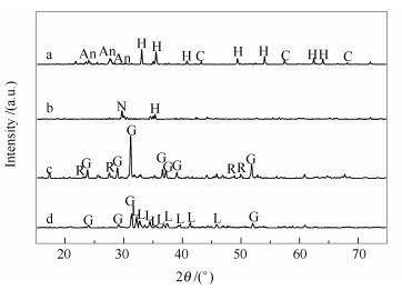 a: CaO 5%; b: CaO 25%; c: CaO 35%; d: CaO 50% An: anorthite; C: corundum; G: gehlenite; H: hematite; L: larnite; N: nepheline; R: rankinite