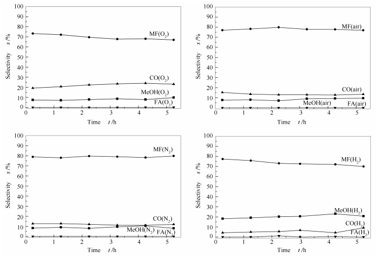 the reactions were conducted at atmospheric pressure and 150 ℃, with GHSV of 1 800 h-1 and DME/O2 ratio of 1:1 for MF selectivity: ▼: N2;