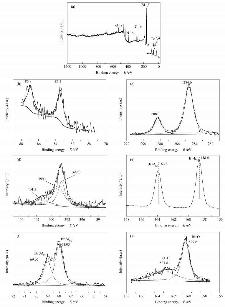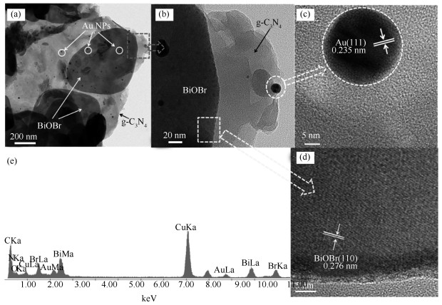 a: g-C3N4; b: BiOBr; c: g-C3N4/BiOBr; d: Au NPs/g-C3N4/BiOBr