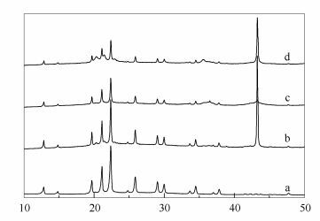 a: AlPO4-5; b: Cu(15)/AlPO4-5; c: Cu(15)-Fe(6)/AlPO4-5; d: Cu(15)-Fe(6)-MgO(1)/AlPO4-5