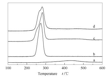 a: Fe(6)/AlPO4-5; b: Cu(15)/AlPO4-5; c: Cu(15)-Fe(6)/AlPO4-5;d: Cu(15)-Fe(6)-MgO(1)/AlPO4-5