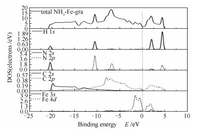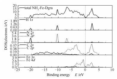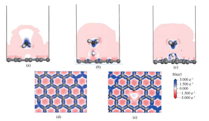(a): adsorption of NH3 on defective surface; (b): adsorption of NH3 on intact graphene surface with Fe; (c): adsorption of NH3 on defective graphene surface with Fe atom; (d): intact graphene surface; (e): defective surface