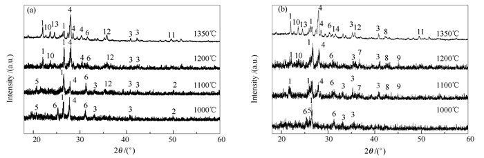 1: quartz, SiO2; 2: rankinite, Ca3Si2O7; 3: mullite, Al6Si2O13; 4: anorthite, CaAl2Si2O8; 5: sillimanite, Al2SiO5; 6: anhydrite, CaSO4; 7: mayenite, Ca12Al14O33; 8: calcium iron oxide, CaO·Fe3O4; 9: alumina, Al2O3; 10: fayalite, Fe2SiO4; 11: calcium iron oxide, CaO·Fe2O3; 12: hercynite, FeAl2O4; 13: yeelimite, Ca4Al6O12SO4; 14: clinotobermorite, Ca5Si6O17 JC: Jincheng coal; XY: Xiangyang coal