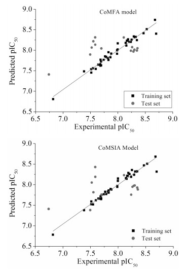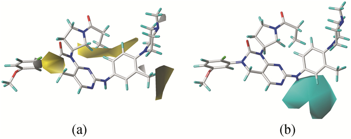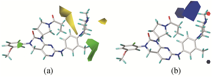 Colony stimulating factor 1 receptor (CSF-1R) is a member of the type Ⅲ receptor tyrosine kinase family, which plays a crucial role in the regulation of the monocyte/macrophage system. Abnormal expression of CSF-1R and its ligands is closely related to tumor progression. Therefore, CSF-1R signaling might be an effective target for anti-cancer therapy. In this study, the three-dimensional quantitative structure-activity relationship (3D-QSAR) models were generated for 54 dihydropyrimido[4, 5-d]pyrimidine CSF-1R inhibitors using comparative molecular field analysis (CoMFA) and comparative molecular similarity indices analysis (CoMSIA) methods. The cross-validation coefficient (q2) of the CoMFA model and CoMSIA model were 0.725 and 0.636, and the fitting verification coefficients (r2) were 0.960 and 0.958. The results showed that both models have good predictive ability. The contour maps of the models could visually reflect the effect of different substituents on the activity, and the stereo field and the hydrophobic field contributed more to the activity. The molecular docking study showed that the amino acid residue Cys666 and Asp796 play a role in the ligand-receptor binding process, and the molecular docking binding mode is consistent with the results obtained by 3D-QSAR. The information could provide a theoretical basis for further optimization of this class CSF-1R inhibitors.