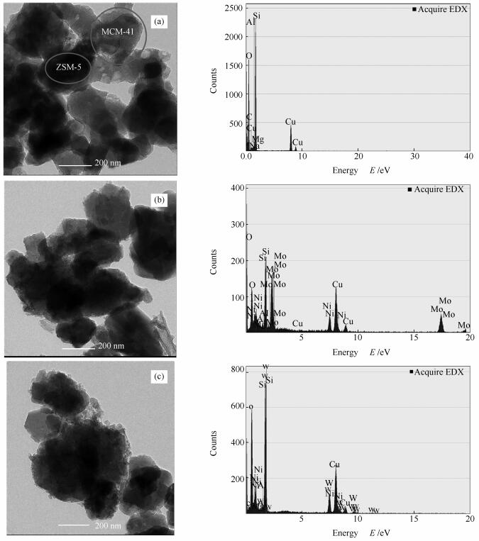 • This work presents a synthesis of bimetallic NiMo and NiW modified ZSM-5/MCM-41 composites and their heterogeneous catalytic conversion of crude palm oil (CPO) to biofuels. The ZSM-5/MCM-41 composites were synthesized through a self-assembly of cetyltrimethylammonium bromide (CTAB) surfactant with silica-alumina from ZSM-5 zeolite, prepared from natural kaolin by the hydrothermal technique. Subsequently, the synthesized composites were deposited with bimetallic NiMo and NiW by impregnation method. The obtained catalysts presented a micro-mesoporous structure, confirmed by XRD, SEM, TEM, EDX, NH3-TPD, XRF and N2 adsorption-desorption measurements. The results of CPO conversion demonstrate that the catalytic activity of the synthesized catalysts decreases in the series of NiMo-ZSM-5/MCM-41 > NiW-ZSM-5/MCM-41 > Ni-ZSM-5/MCM-41 > Mo-ZSM-5/MCM-41 > W-ZSM-5/MCM-41 > NiMo-ZSM-5 > NiW-ZSM-5 > ZSM-5/MCM-41 > ZSM-5 > MCM-41. It was found that the bimetallic NiMo-and NiW-ZSM-5/MCM-41 catalysts give higher yields of liquid hydrocarbons than other catalysts at a given conversion. Types of hydrocarbon in liquid products, identified by simulated distillation gas chromatography-flame ionization detector (SimDis GC-FID), are gasoline (150-200 ℃; C5-12), kerosene (250-300 ℃; C5-20) and diesel (350 ℃; C7-20). Moreover, the conversion of CPO to biofuel products using the NiMo-and NiW-ZSM-5/MCM-41 catalysts offers no statistically significant difference (P > 0.05) at 95% confidence level, evaluated by SPSS analysis.