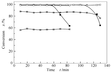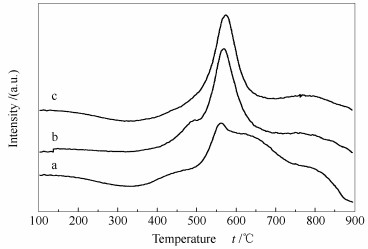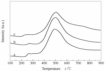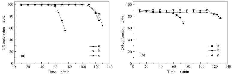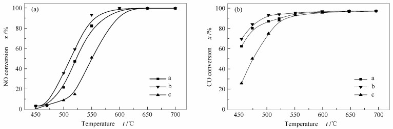 a: Ce-La/MgAl2O4-0.2; b: Ce-La/MgAl2O4-0.5; c: Ce-La/MgAl2O4-1.0 reaction conditions: 0.1% NO, 4% CO, 2% O2, 0.08% SO2 in balance N2, GHSV=24 000 h-1, t=700 ℃