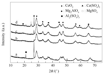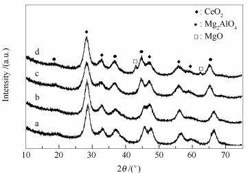 a: Ce/MgAl2O4-0.2; b: Ce-La/MgAl2O4-0.2; c: Ce-La/MgAl2O4-0.5; d: Ce-La/MgAl2O4-1.0
