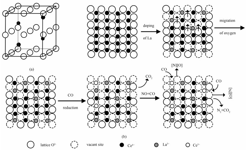 (a) the schematic diagram of crystal structure of Ce-O-La solid solution and (b) the possible pathway for generation of oxygen vacancies and NO removal by CO over Ce-O-La solid solution