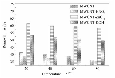 • The texture and surface chemistry of carbon nanotubes before and after chemical treatment using ZnCl2, KOH and HNO3 were determined by scanning electronic microscope, X-ray diffraction, N2 adsorption, and Boehm titration; and the effect of adsorptive conditions (contact time, initial concentration and temperature) on phenol removal and the thermodynamic and kinetic behavior and adsorption mechanism were investigated by tests and data fitting with three kinetic models (pseudo-first order, pseudo-second order and the Elovich kinetic equations) as well as thermodynamic equation. The results show that the treatment by HNO3, ZnCl2 or KOH less changes the BET surface area of carbon nanotubes, but obviously changes the surface chemical property. Specifically, the treatment by HNO3 obviously enhances surface acidic groups and slightly increases basic groups, whereas the treatment by ZnCl2 or KOH greatly decreases surface carboxyl groups and lactonic groups but obviously increases surface basic groups, which affects the phenol removal by carbon nanotubes. It is found that the phenol removal by carbon nanotubes treated with ZnCl2 or KOH increases due to a decrease in surface carboxyl groups of carbon nanotubes, but HNO3 treatment slightly reduces the phenol removal possibly because the adsorption is influenced by both structure and surface chemical property. Moreover, the adsorption of phenol by carbon nanotubes is spontaneous, exothermic and physically controlled, and the adsorption process of phenol by carbon nanotubes complies with the pseudo-second order equation.