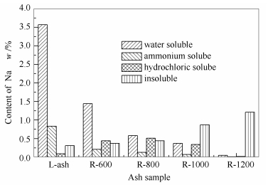 • As a typical Zhundong coal, Wucaiwan coal was chosen as the object of the investigation. The combustion ash with coal sample and the reheated ash with ashing sample at 400℃ were prepared in a muffle furnace. K-type thermocouple was used to measure the temperature, XRF and XRD were used to investigate the composition of ash, and the sequential chemical extraction was used to examine the modes of occurrence of Sodium. The results show that the combustion ash and the reheated ash have marked differences in composition and melting points, sodium content in the reheated ash is higher than that in the combustion ash and the melting temperature of the reheated ash is lower than that in the combustion ash. With the increase of temperature, the total content of sodium decreases obviously, the water-soluble and ammonia-soluble sodium decreases rapidly, while the HCl soluble sodium increases first and then decreases and the insoluble sodium increases. The sodium released is mainly soluble. Heating temperature and time have an influence on the releasing of sodium, and the combustion reaction leads to the temperature on particle surface higher than surrounding temperature by 200℃, which is the main cause of releasing more sodium.