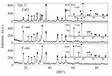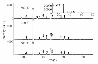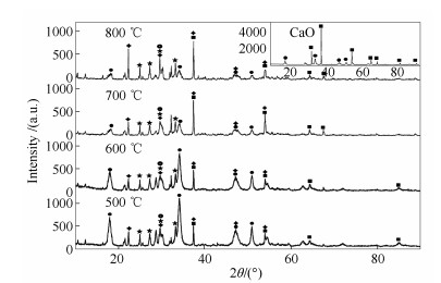 ■: CaO #37-1497; ●: Ca(OH)2 #44-1481; ✦: CaSeO3 #35-0884; ★: CaSeO3 #35-0885
