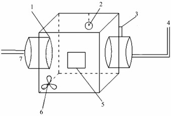 1: multiorifice plate; 2: energy saving lamp; 3: external power receptacle; 4: sampling port/air outlet 5: viewing window; 6: fan; 7: air inlet
