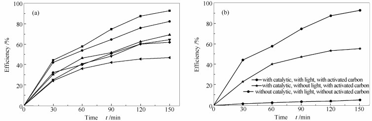 ■ : Ce(1%)-Co(5%)-TiO2; ● : Ce(1%)-TiO2; ▲ : Ce(1.5%)-TiO2; ▼: Ce(0.5%)-TiO2; ◆ : commercial catalyst (reaction condition: 3 g of catalyst, cNO= 672μg/m3); ◀: TiO2