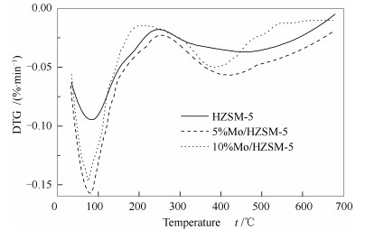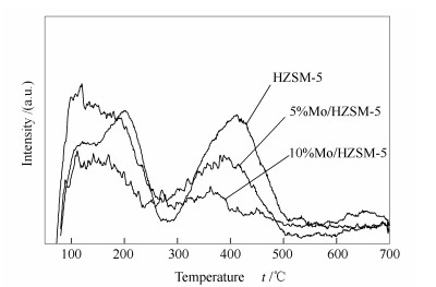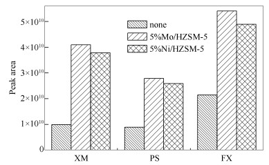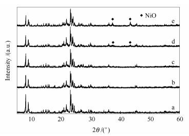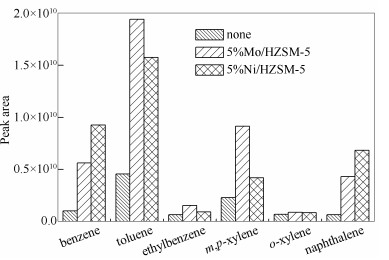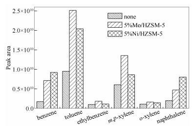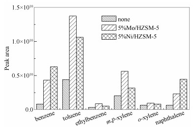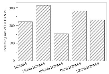 a: HZSM-5; b: 5%Mo/HZSM-5; c: 10%Mo/HZSM-5; d: 5%Ni/HZSM-5; e: 10%Ni/HZSM-5