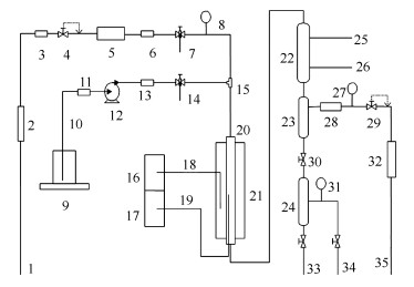 1: hydrogen source; 2: drier; 3: filter; 4: pressure reducing valve; 5: gas flowmeter; 6: one way valve; 7: gas feed vent; 8: reactor inlet pressure; 9: electronic balance; 10: liquid feed; 11: filter; 12: feed pump; 13: one way valve; 14: liquid feed vent; 15: gas liquid mixing tee; 16: temperature controller; 17: temperature displayer; 18: thermocouple for temperature controller; 19: thermocouple temperature displayer; 20: tubular reactor; 21: heating furnace; 22: condenser; 23: high separator; 24: low separator; 25: cooling water outlet; 26: cooling water inlet; 27: reactor outlet pressure; 28: dryer; 29: back pressure valve; 30: sampling valve; 31: sampling pressure indicator; 32: rotameter; 33: sampling port; 34: sampling vent; 35: tail gas vent