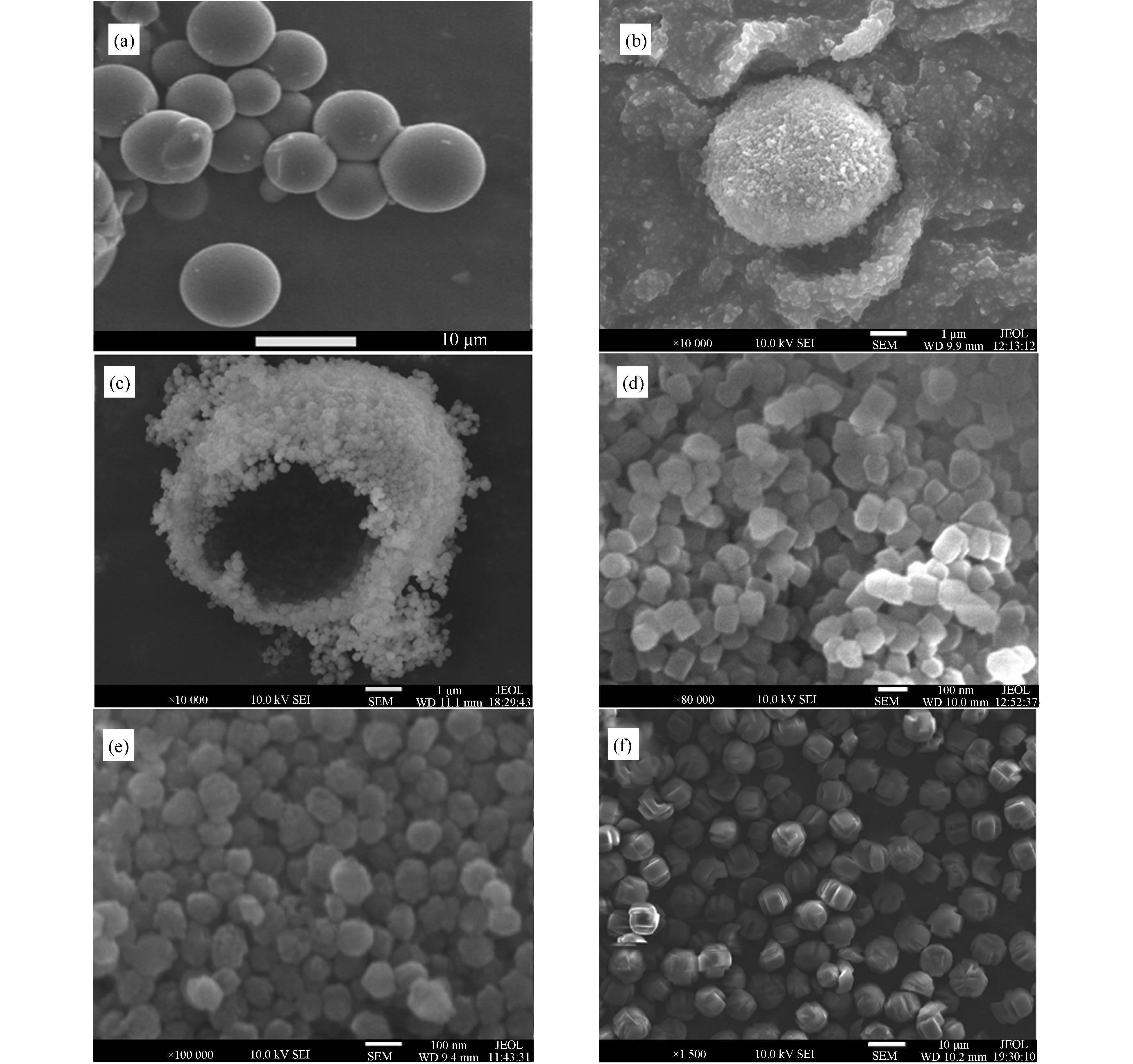 (a): carbon microspheres; (b): core-shell structured sample C@Sil; (c): crushed Silicalite-1 hollow sphere Sil-HS;(d): surface of Sil-HS; (e): sample Sil-100; (f): sample Sil-5000