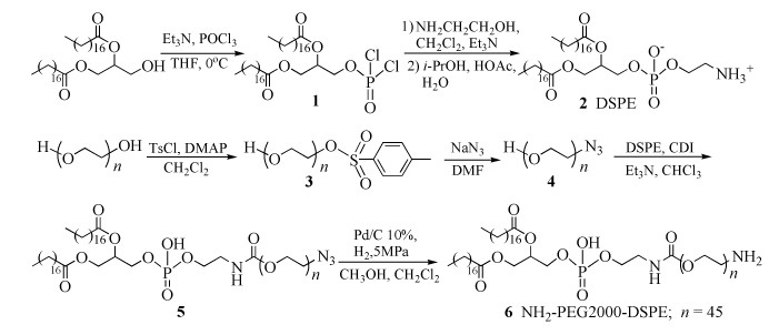 DSPE was synthesized by reactions with glycerol-1, 2-distearate, phosphorusoxychloride and 2-aminoethanol as raw materials. N3-PEG2000 was achieved by an efficient two step process from readily available PEG2000. Subsequently, N3-PEG2000-DSPE was obtained by linking DSPE to N3-PEG2000 via CDI. Finally, catalytic hydrogenation of the azido group yielded the target compound NH2-PEG2000-DSPE, which was characterized by IR, 1H NMR, and MS.