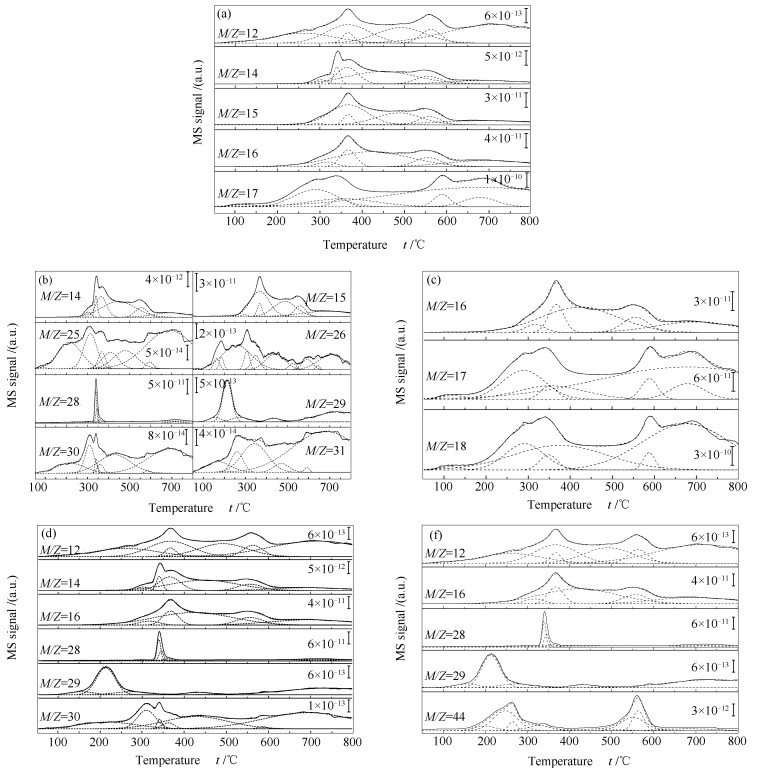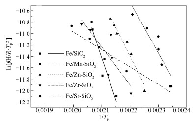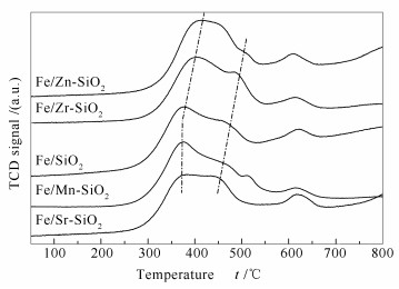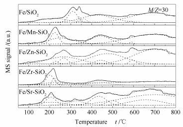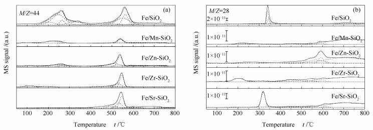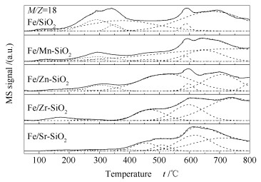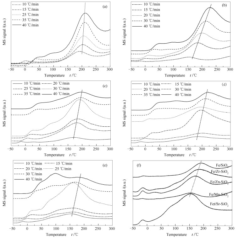 (a): Fe/SiO2; (b): Fe/Mn-SiO2; (c): Fe/Zn-SiO2; (d): Fe/Zr-SiO2; (e): Fe/Sr-SiO2; (f): 10 ℃/min