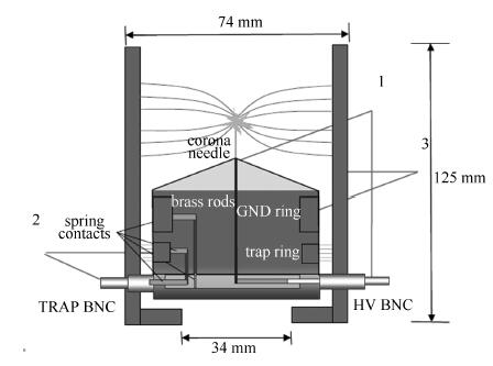 1: from charger BNC connector to charger needle; 2: from trap BNC connector to trap ring; 3: from charger frame to ground ring