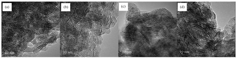 (a): Mo/Al catalyst after methanation reaction without water; (b): Mo/Al catalyst after methanation reaction with water; (c): Co-Mo/Al catalyst after methanation reaction without water; (d): Co-Mo/Al catalyst after methanation reaction with water