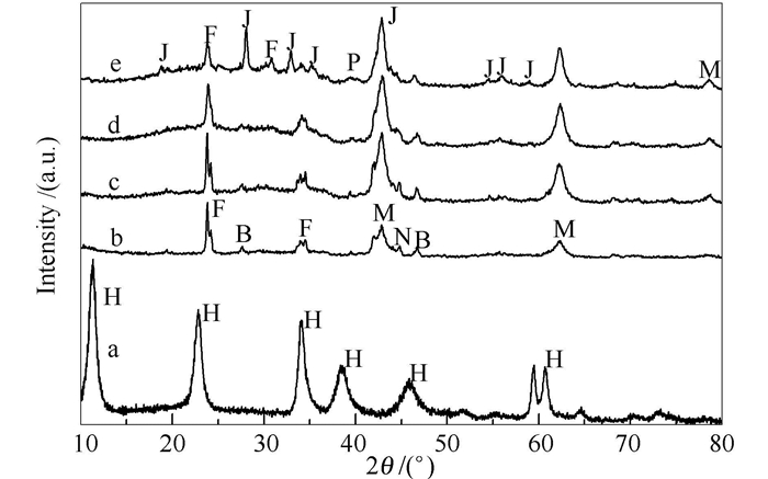 a: MgFe-HTLC; b: 500℃; c: 600℃; d: 700℃; e: 800℃