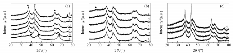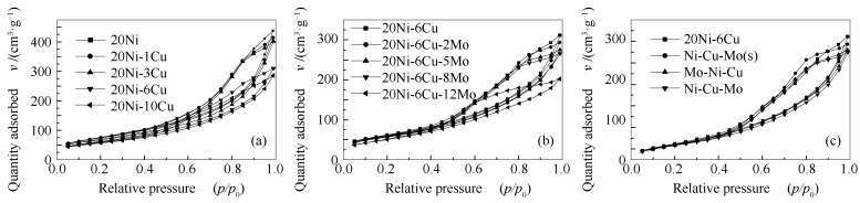 (a): γ-Al2O3; (b): 20Ni-6Cu/γ-Al2O3; (c): 20Ni-6Cu-5Mo/γ-Al2O3