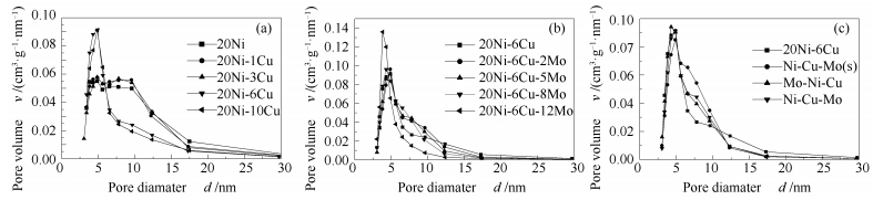 (c): a: 20Ni-6Cu/γ-Al2O3; b: Ni-Cu-Mo(s)/γ-Al2O3; c: Mo-Ni-Cu/γ-Al2O3; d: Ni-Cu-Mo/γ-Al2O3