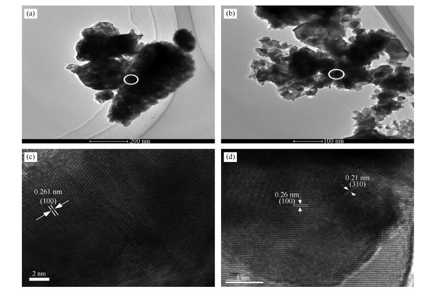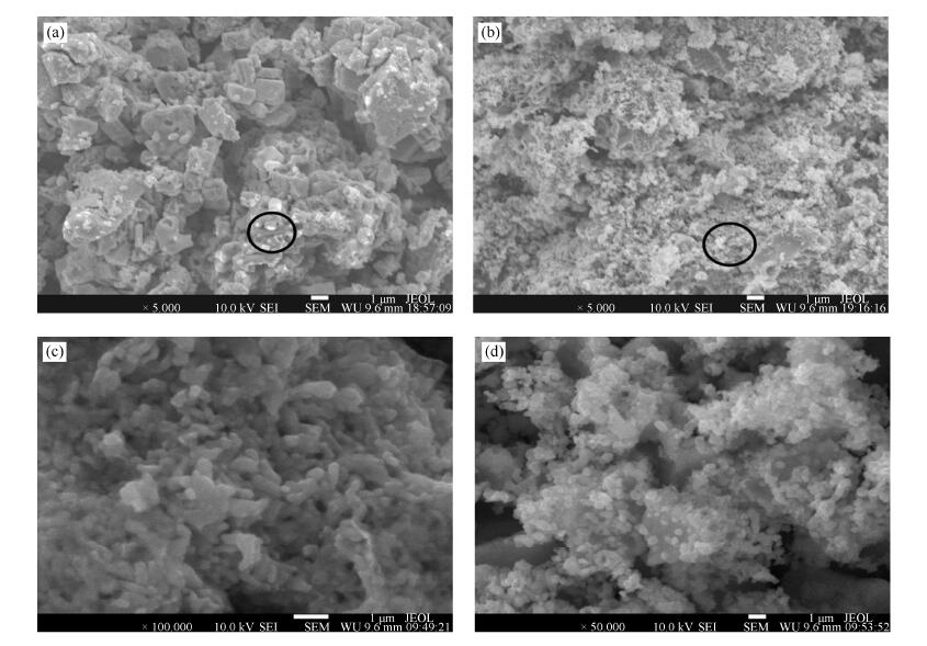 (a): β-Mo2C; (b): Ni/β-Mo2C; (c): an enlarged image of β-Mo2C; (d): an enlarged image of Ni/β-Mo2C