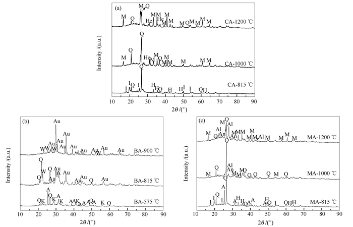 (a): Jincheng coal ash (CA); (b): rice straw ash (BA); (c): mixed ash (MA) Q: quartz (SiO2); I: illite (K1.5Al4(Si6.5Al1.5) O20(OH)4); H: hematite (Fe2O3); M: mullite (3Al2O3·2SiO2); He: hercynite (FeO·Al2O3); A: anhydrite (CaSO4); K: kaliophilite (KAlSiO4); Au: augite (Ca (Mg, Fe) Si2O6); W: wollastonite (CaO·SiO2); Al: albite (NaAlSi3O8); An: anorthite (CaAl2Si2O8)