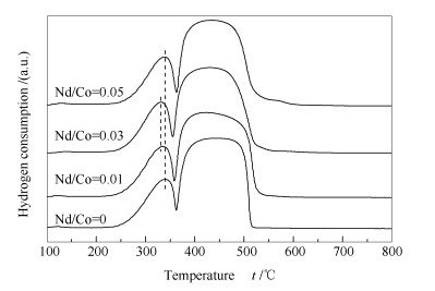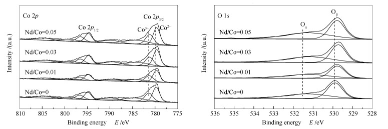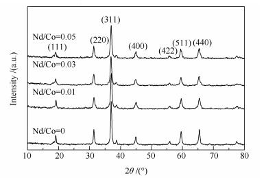 (a): Nd/Co=0 (Co3O4); (b): Nd/Co =0.01; (c): Nd/Co =0.03; (d): Nd/Co =0.05