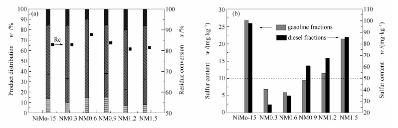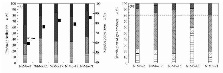 (a): product distribution and residue conversion (Rc); (b): Gaseous product distribution reaction condition: t=395℃, p=8MPa, WHSV = 0.6h-1, H2/oil = 800