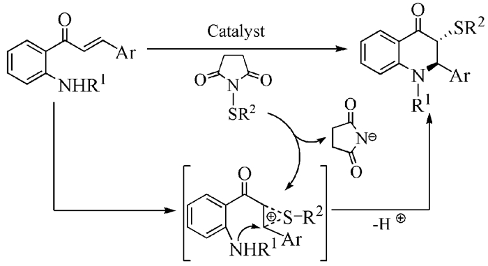 The syntheses of 2-aryl-3-sulfenyl-2, 3-dihydroquinolin-4(1H)-ones are realized using (E)-1-(2-tosylaminophenyl)-3-arylprop-2-en-1-ones (1) and N-sulfanylsuccinimides as substrates through electrophilic cyclization. With BF3·Et2O (20(mol)%) as the catalyst and 1, 2-dichloroethane as the solvent, the reaction can be performed well at 60℃ and give the desired 2-aryl-3-sulfenyl-4(1H)-quinolinones in a yield of 60%~92%. Compounds 3a-3l have not been reported in the literature, and their structures are confirmed by 1H NMR, 13C NMR and HR-MS.